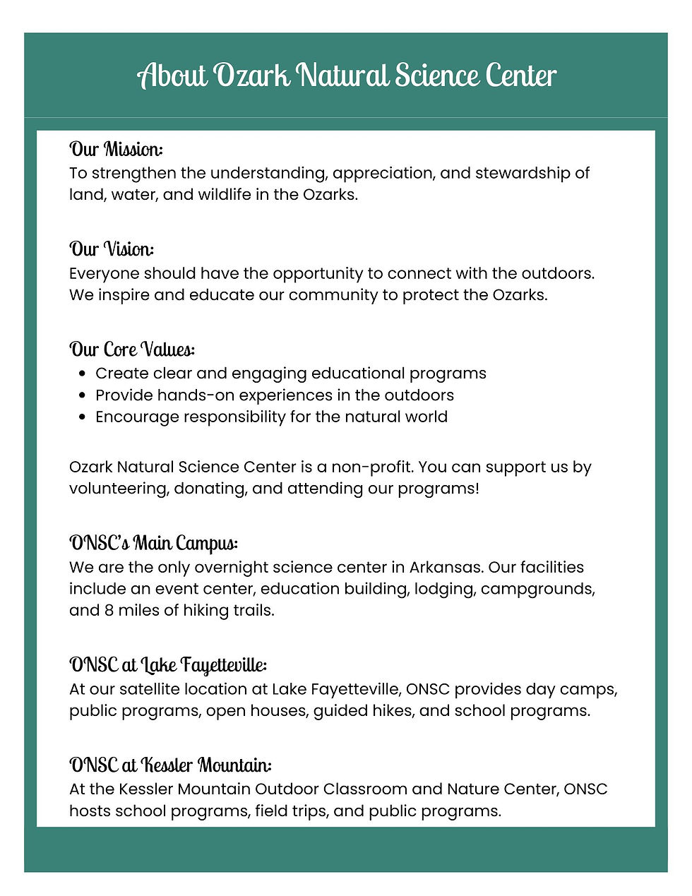 Let Ozark Natural Science Center help you create the perfect event, reunion, retreat, or conference. Contact us to receive a quote for multiple rentals, or book individual rentals on Airbnb (links below).